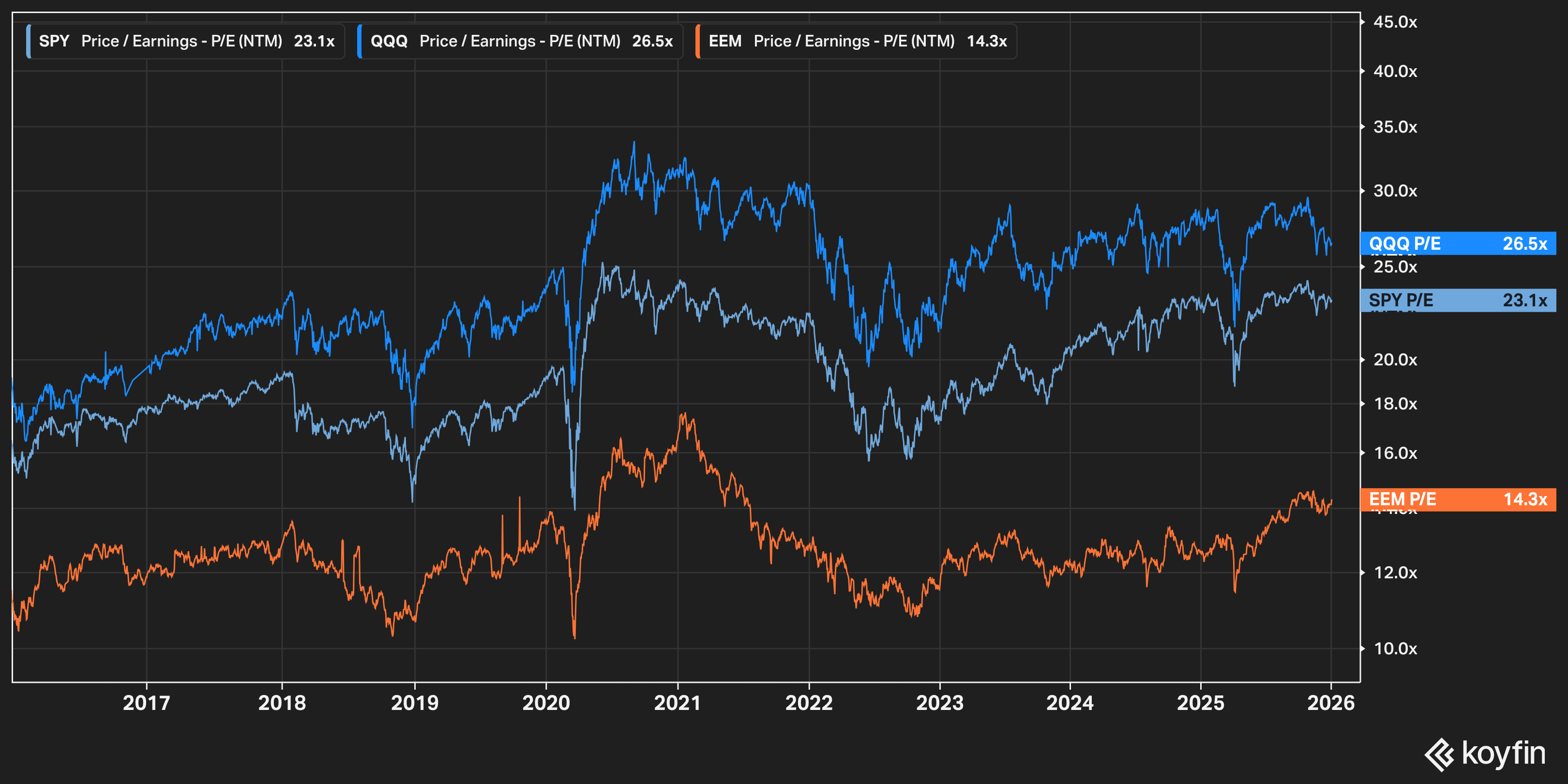Meanwhile, emerging markets are trading around ~14x earnings. The valuation gap between the US and the rest of the world is as wide as it’s been in years.