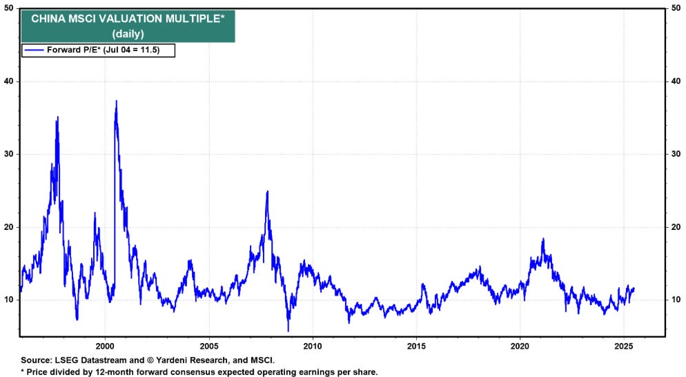 Investor response has been somewhat robust, reflected by surging southbound flows via Stock Connect—reaching approximately US$78 billion year-to-date and projected to surpass US$110 billion by year-end. This activity is spurred by compelling dividend yields and valuations, with MSCI China still trading around 11x forward earnings.