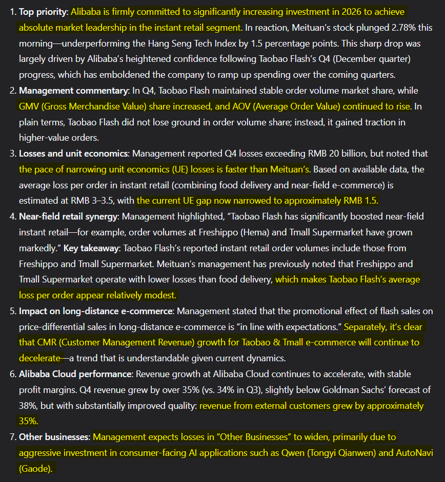 Ahead of February’s official earnings release, Alibaba held pre-earnings guidance calls with major sell-side institutions. A contact of mine was on the Citi-hosted call and was kind enough to share his notes with me.