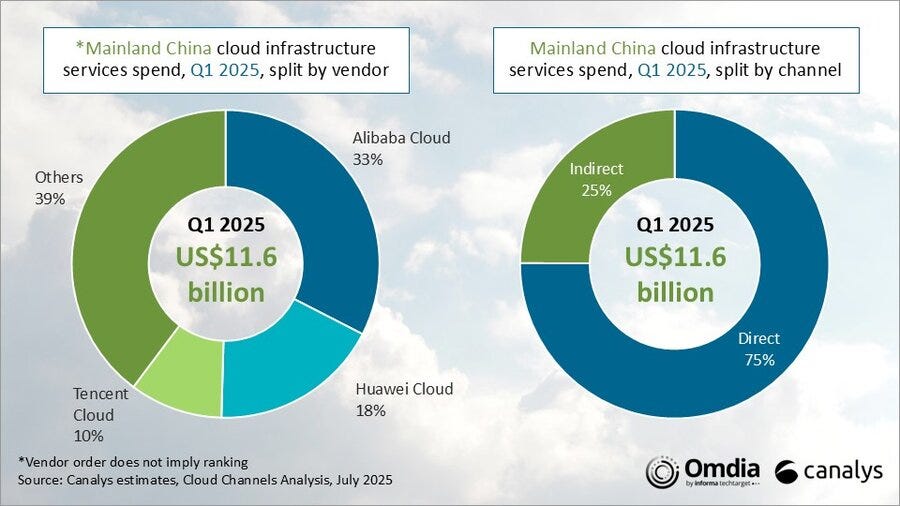 When I look at the numbers, Alibaba’s cloud business is in a strong position and quietly picking up speed. In China—the second-largest cloud market in the world—it’s been the clear leader for years, holding roughly a third of the market. Chinese companies spent about $11.6 billion on cloud infrastructure in the first quarter alone, according to Canalys, up 16% from last year.