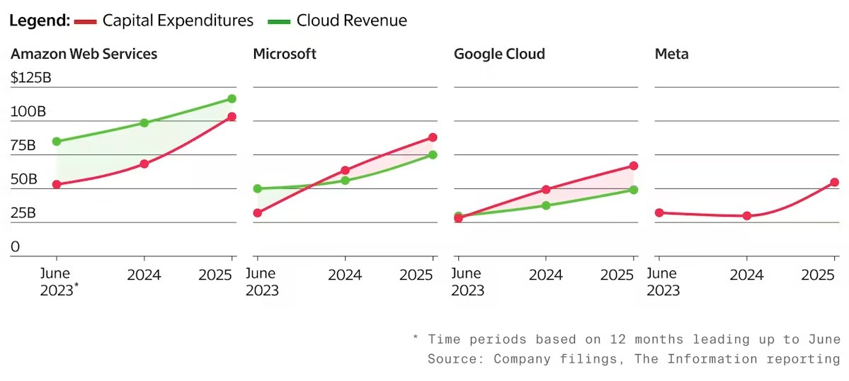 And as the chart below shows, in several cases the capex curve is now climbing faster than revenue itself—a sign of just how aggressive this race has become.