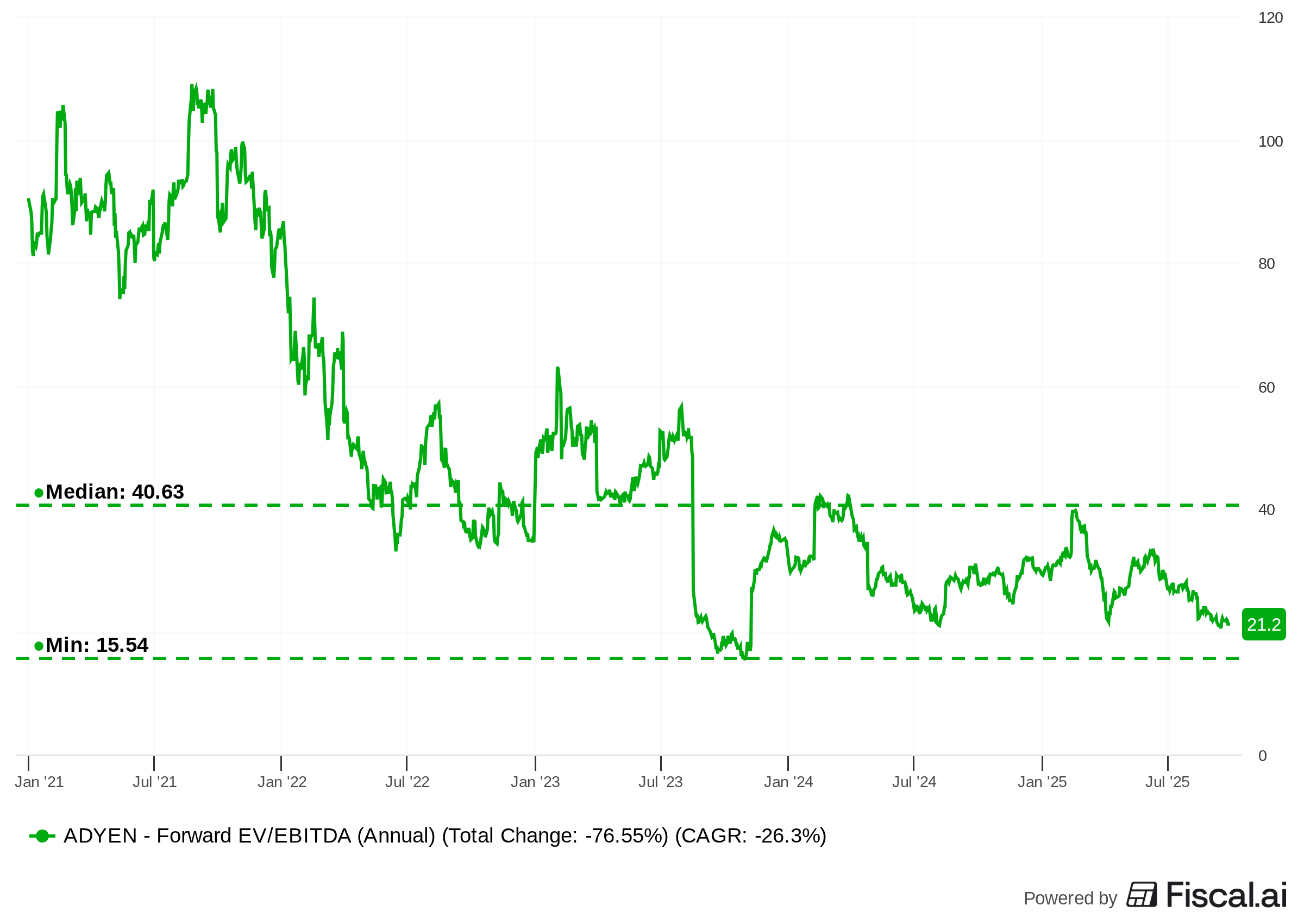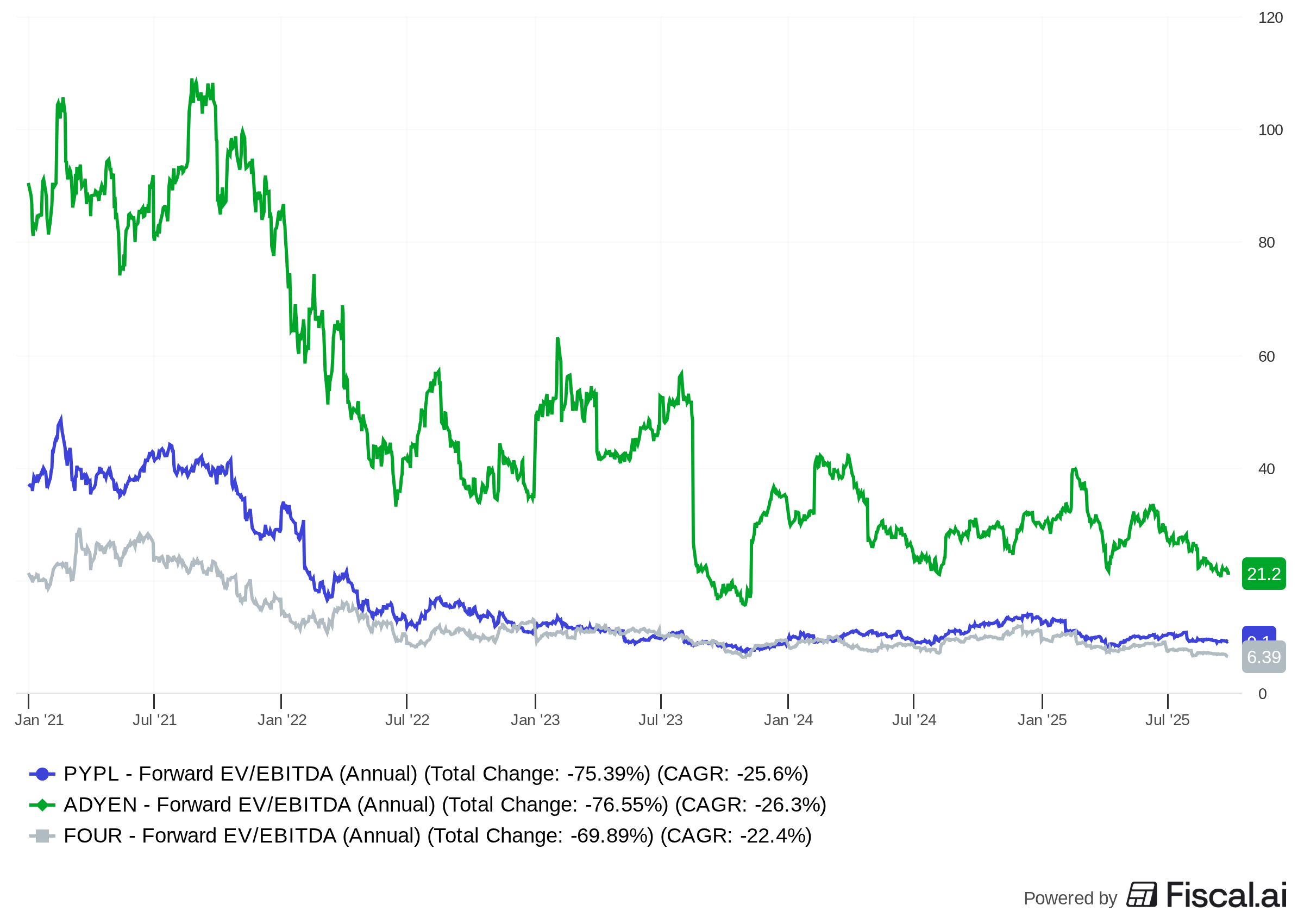 Fast forward to today, and Adyen is basically the cheapest it’s ever been as a public company. Not “cheap” like PayPal, but cheap relative to what it’s been historically—low 20s forward EV/EBITDA versus the nosebleeds it once commanded.