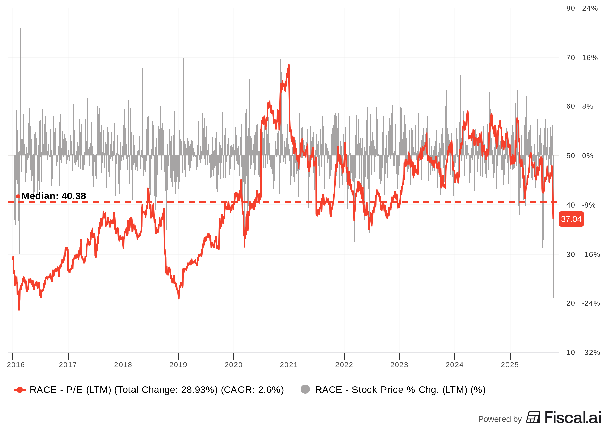 This isn’t a trade. It’s the beginning of a position I’d like to build if we keep seeing weakness. The stock is in the middle of its largest drawdown in years, and while Ferrari has always deserved a premium multiple, that premium is finally starting to compress into something I can live with.