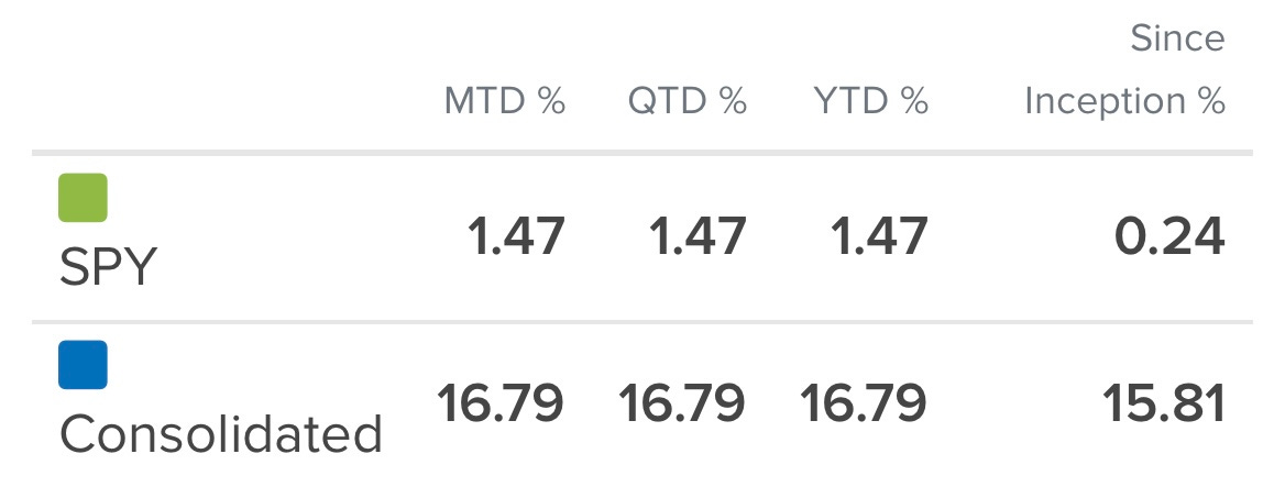 Through the end of January, the portfolio is up +16.79% YTD. SPY did about 1.5% over the same period.