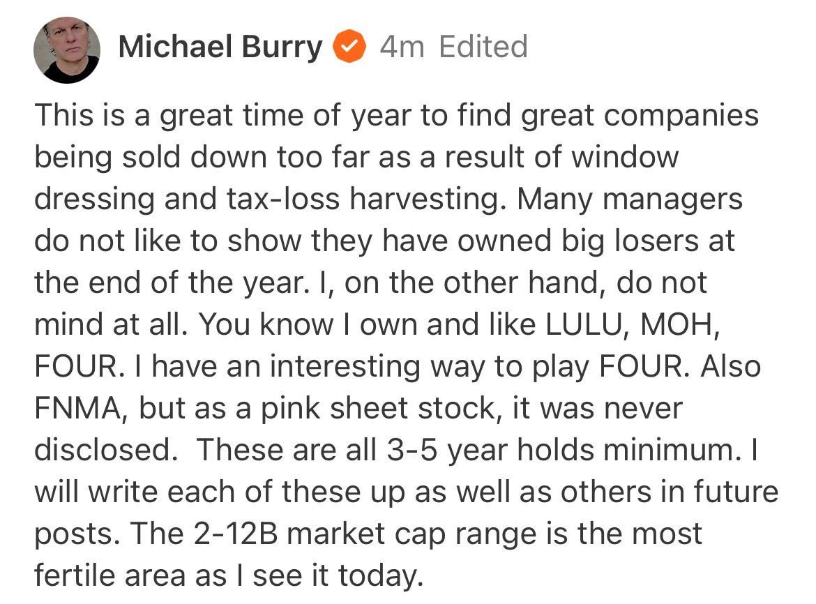 The thing about Burry is he sees things other people don't. Staying put long enough to benefit from what he sees is another matter. In late November, he posted that he owned FOUR and considered it a 3-5 year hold.