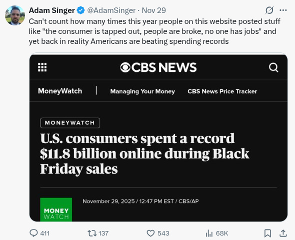 Black Friday’s record is a great headline and a messy signal. It tells you people are still spending. It does not tell you how much of that is the top 10% and how much is the rest of the country stretching with credit and BNPL. It doesn’t resolve the debate over “strong consumer” versus “fragile consumer.” It just sits on top of a K-shaped reality that hasn’t gone away.