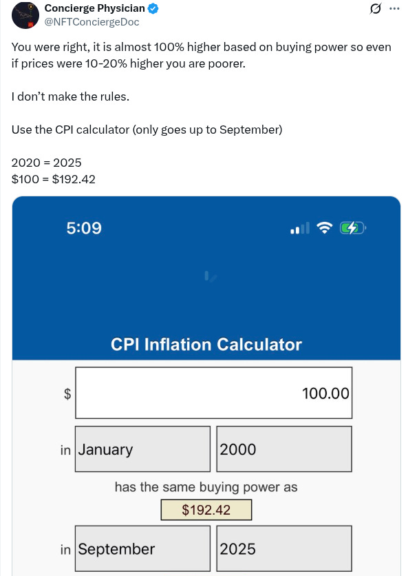 And then there was Camp Three. This is the camp that reminds you X is one of the great petri dishes for confidently wrong people. My personal favorite was a guy insisting that $100 five years ago is now basically $150, backed by a screenshot of a CPI calculator. Checkmate, inflation deniers.