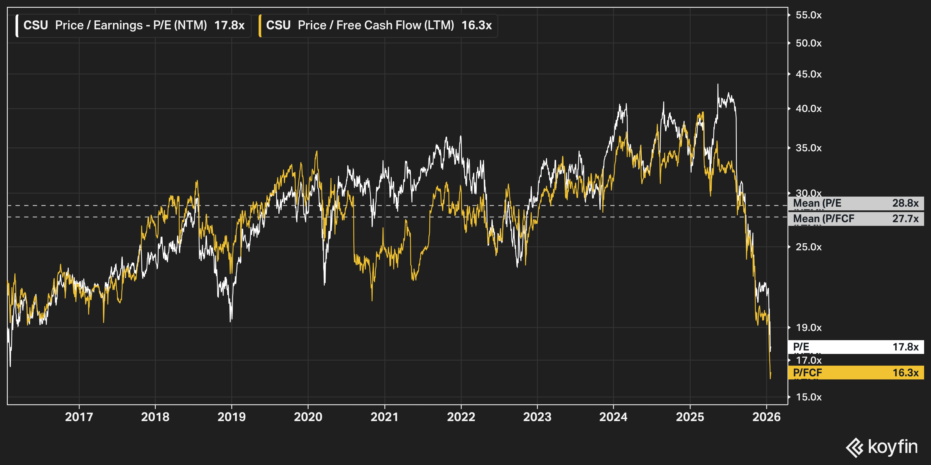 Constellation currently trades at ~18x earnings and ~16x FCF. The historical averages are closer to ~30x. It’s the cheapest it’s been in nearly a decade.