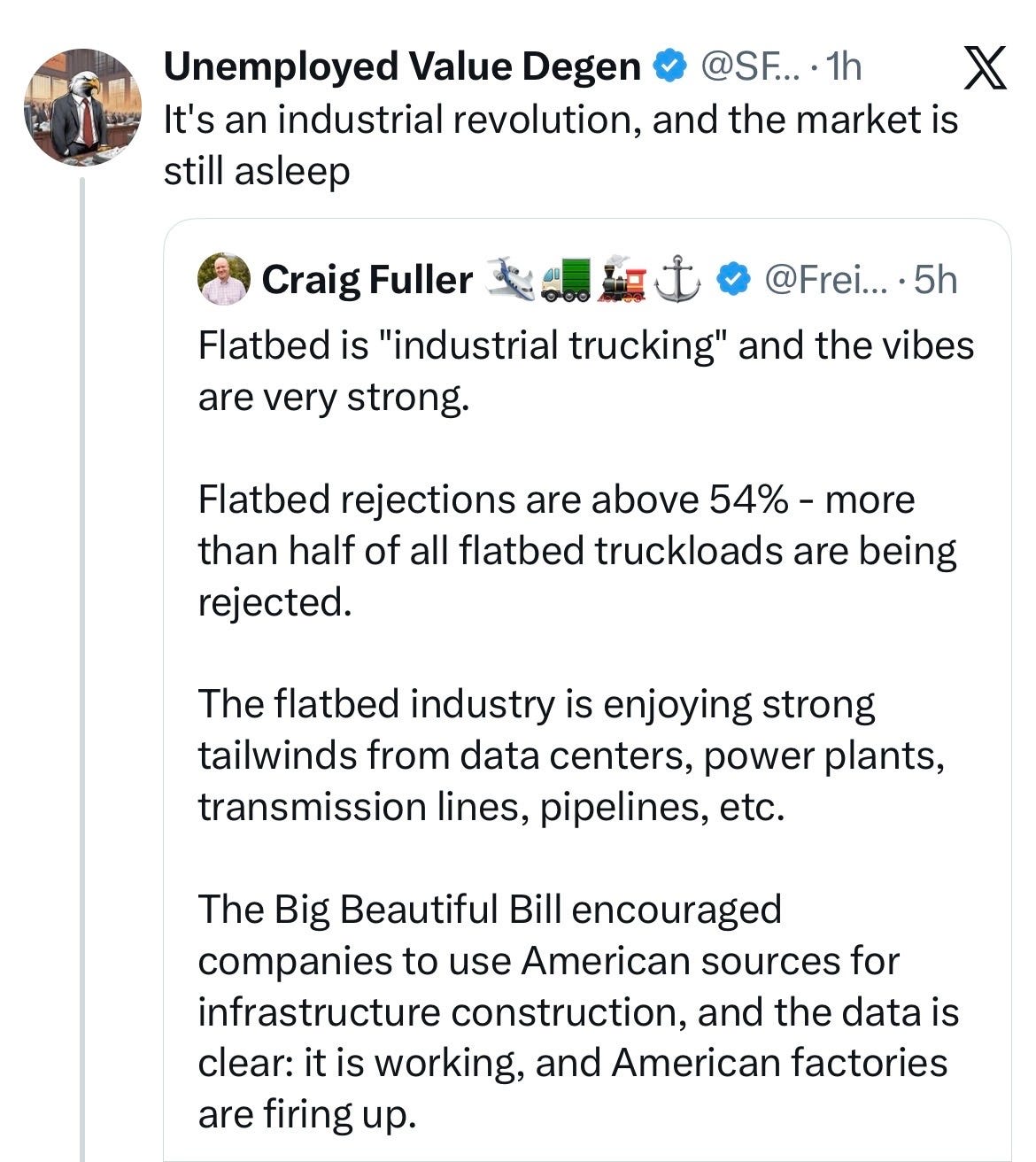 He reposted a tweet from Craig Fuller showing flatbed tender rejections above ~54%, alongside a note about industrial demand ramping through data centers, power plants, transmission lines, and pipelines.