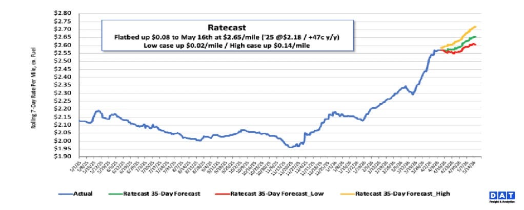 It’s not just the rejection data either. Spot rates are ripping too. National flatbed went nowhere for most of 2025, and then late last year it started climbing and just hasn’t stopped. DAT has it at $2.65/mile by mid-May, up 47 cents from the same time last year. Call it ~22% YoY.