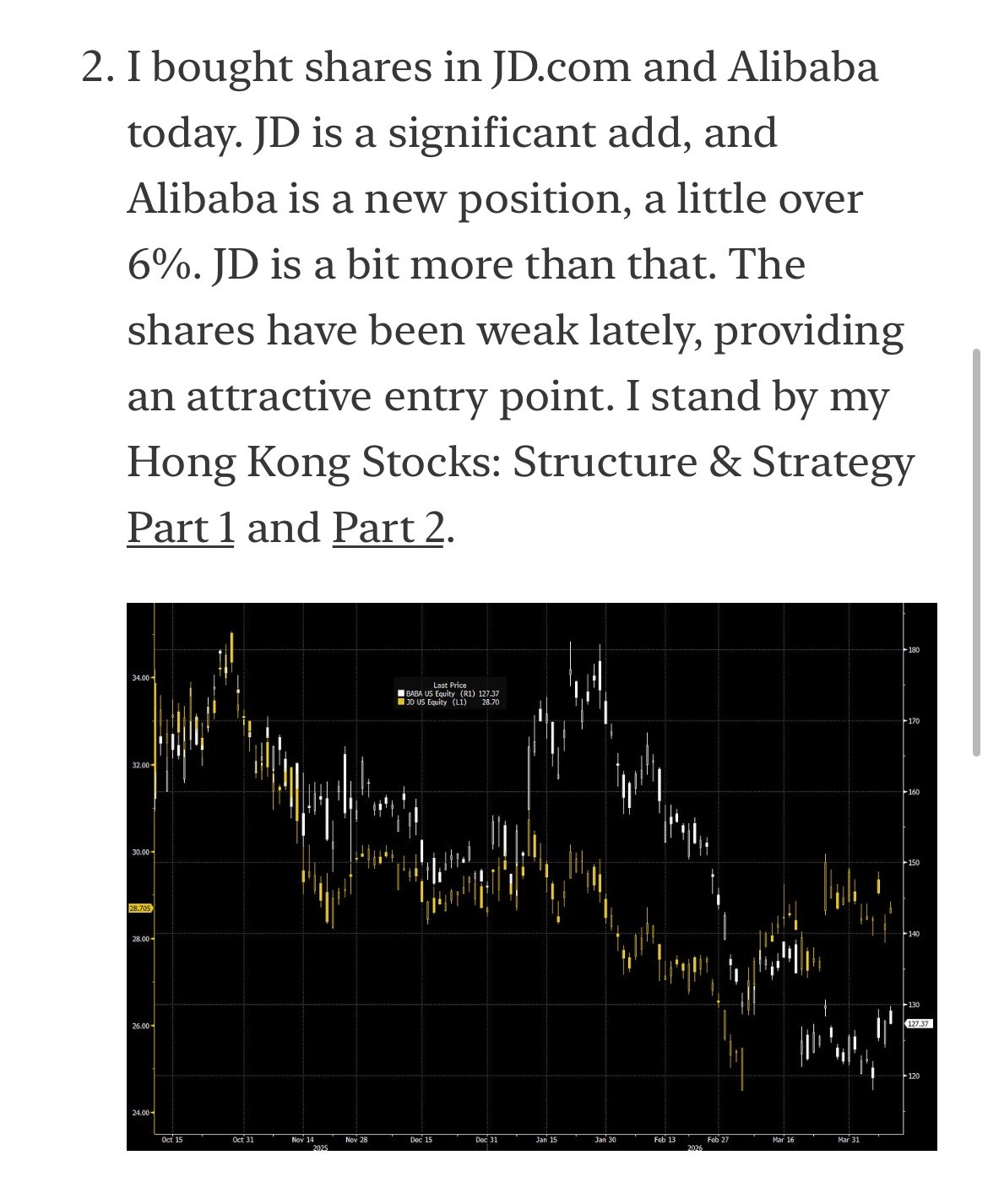 Wanted to post a quick trade update on the portfolio. Yes, the format was inspired by Burry’s new posts, and quite fitting considering he just disclosed he went long Alibaba and JD himself.