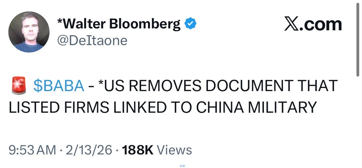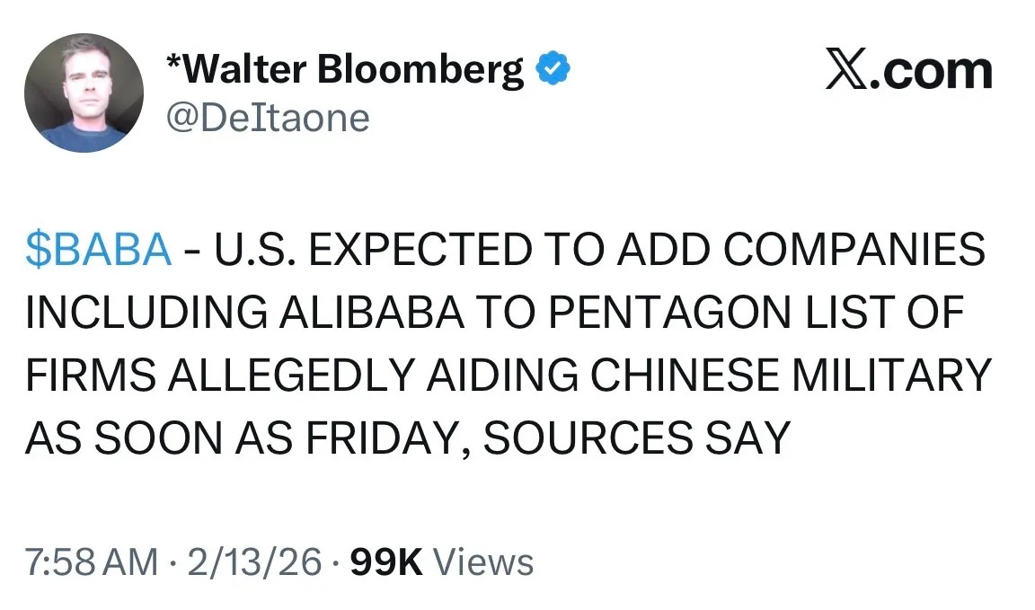 Around 8 AM on the Friday before Valentine's Day, Walter Bloomberg tweets that the US is expected to add Alibaba to the Pentagon's list of firms allegedly aiding the Chinese military. Stock immediately starts selling.