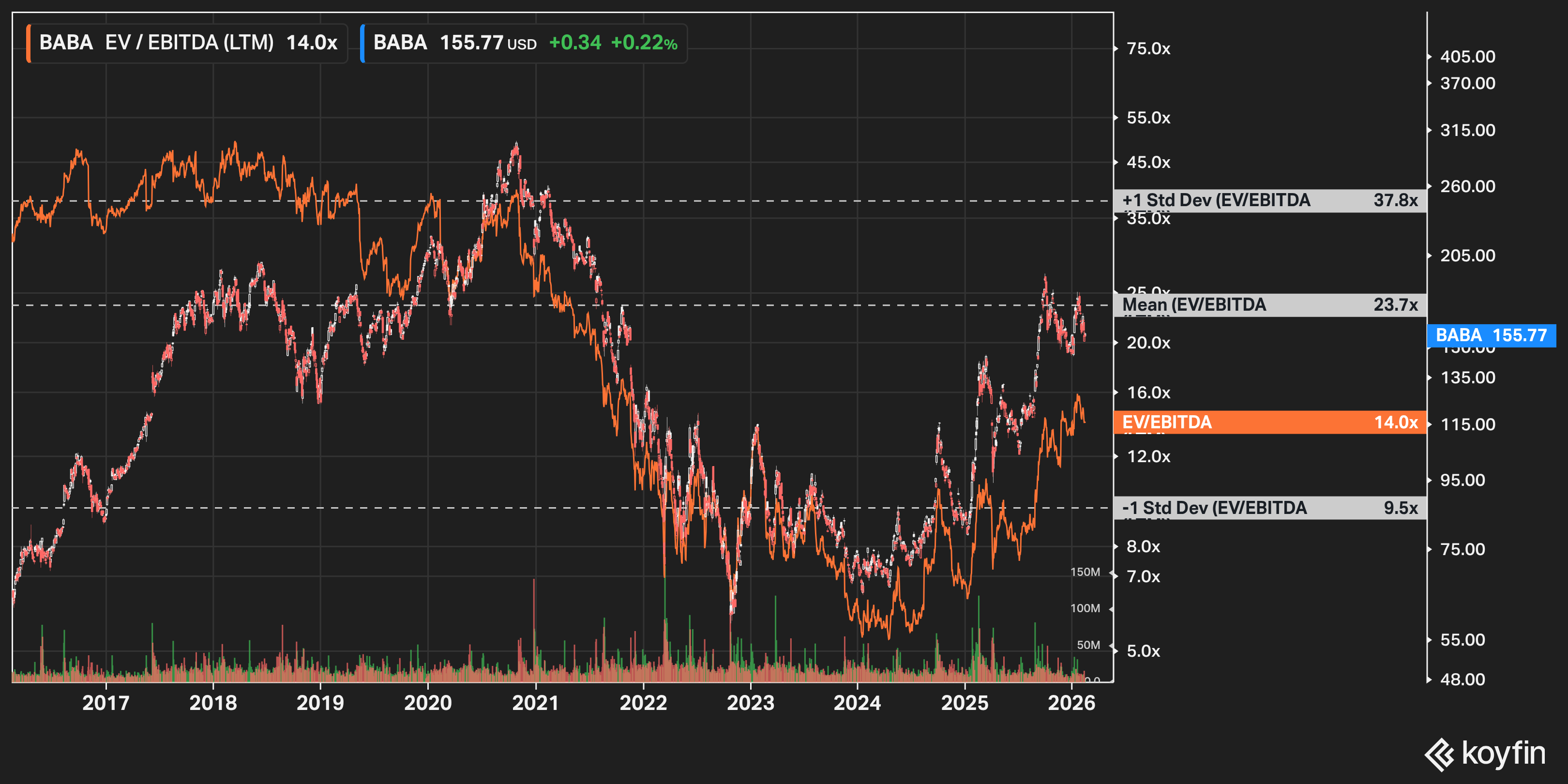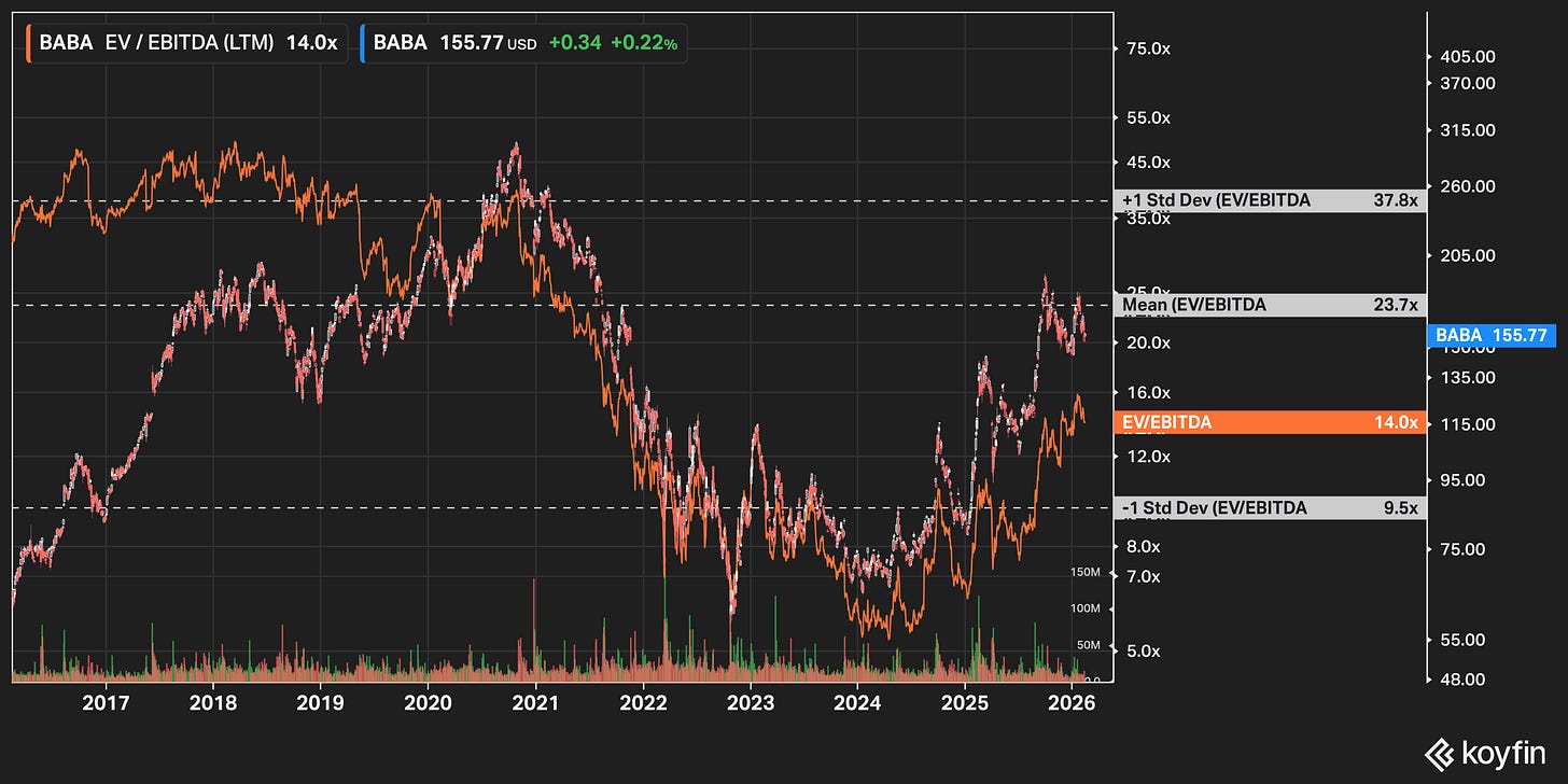 The stock has pulled back to about $155 which is well off its highs of $190+ from last October. That’s roughly ~14x EBITDA for the largest cloud provider in Asia, the most downloaded open-source AI models on the planet, a dominant quick commerce position that didn’t exist a year ago, and a pending deal to power Apple Intelligence in China whenever that finally gets through regulators.