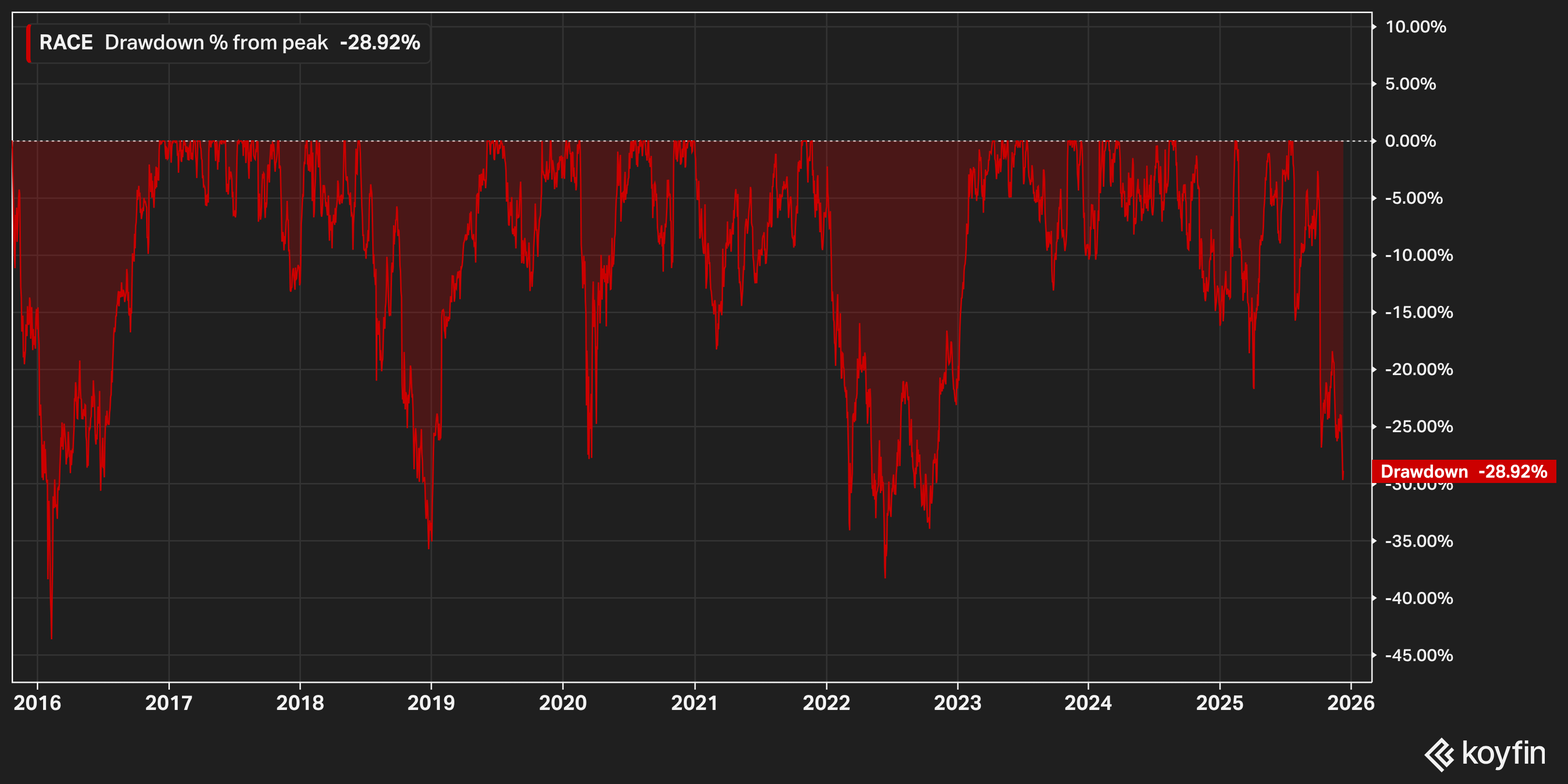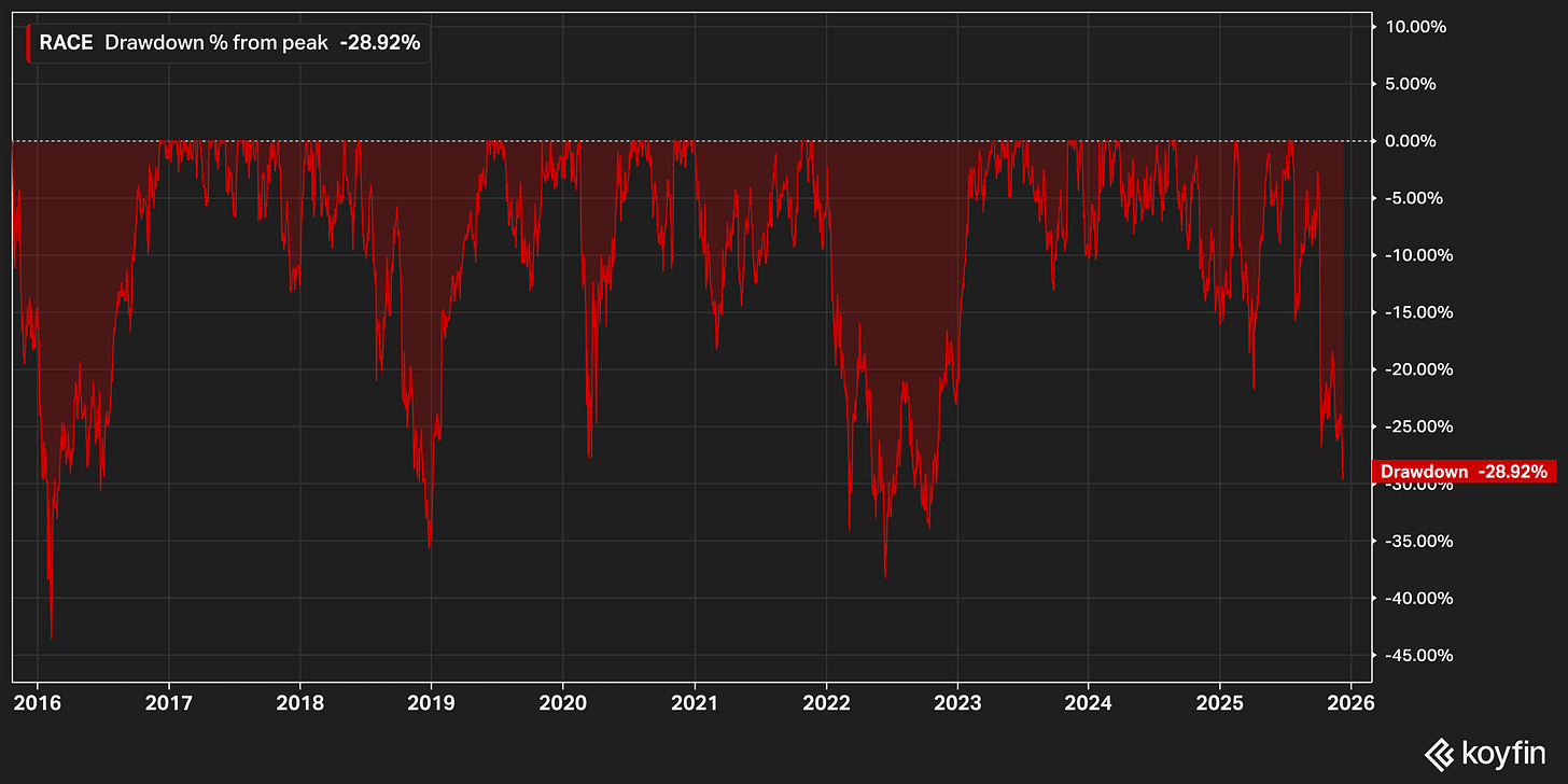 This was a premium-multiple compounder that got even more premium during the “quality at any price” phase, and now the market is doing the reverse. It’s happening to lots of the usual suspects. Ferrari just isn’t used to being treated like a normal stock.