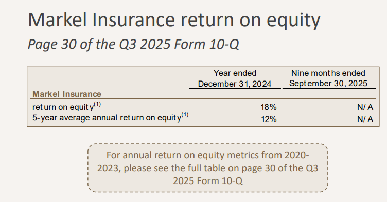 This feeds straight into returns. Insurance ROE was 18% in 2024, with a 12% five-year average. For a conservative writer that runs with low leverage, that is excellent. It says the core book is earning well above its cost of capital without financial engineering.