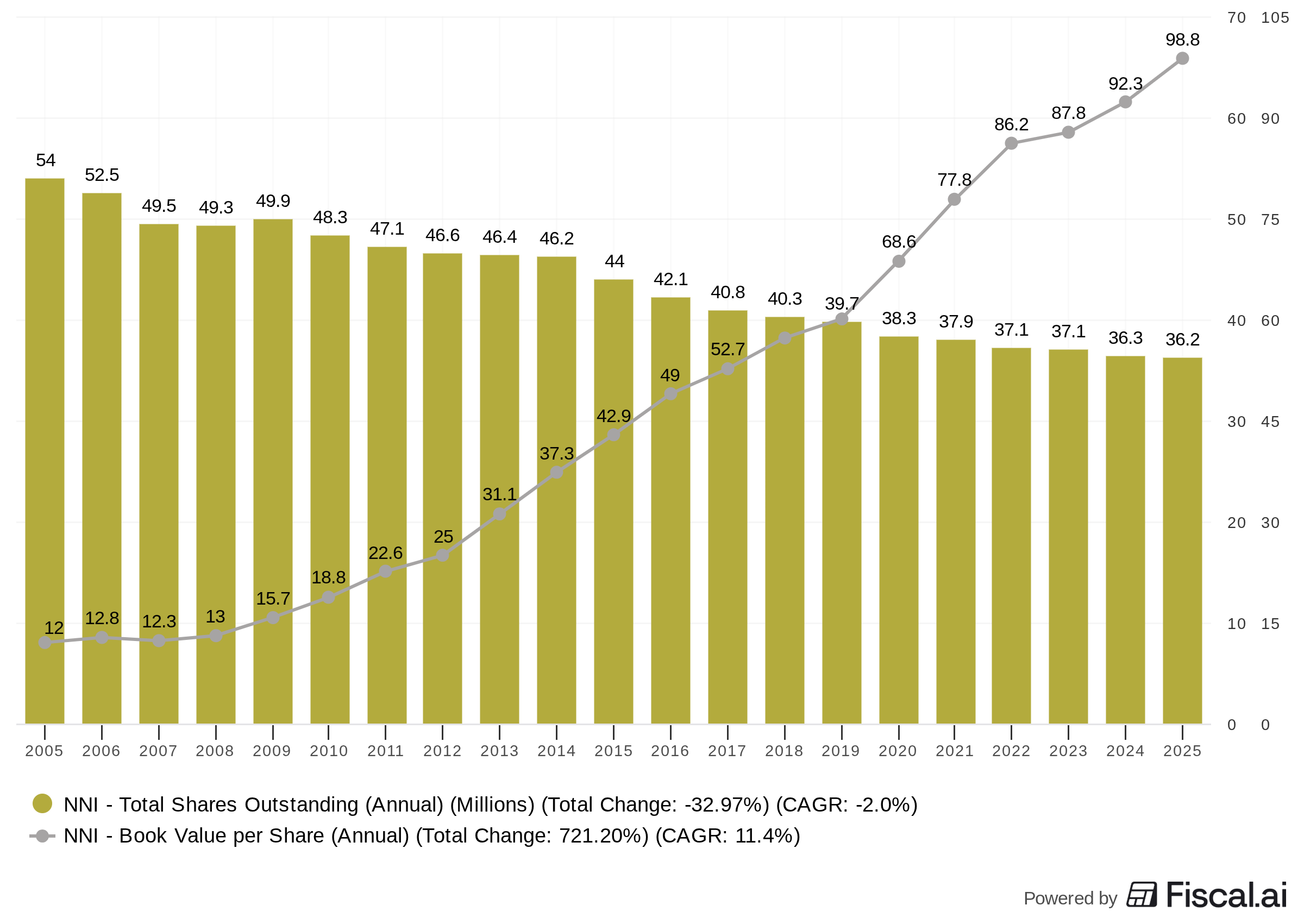 Over time that shows up in book value per share, buybacks, and a steady dividend. Since 2005, book value per share has grown at roughly ~11% a year, while total shares outstanding have shrunk by about a third.